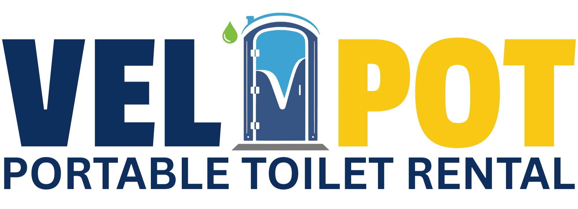 Two portable toilets branded Velpot, positioned side by side on a grassy area with trees and a chain-link fence in the background.